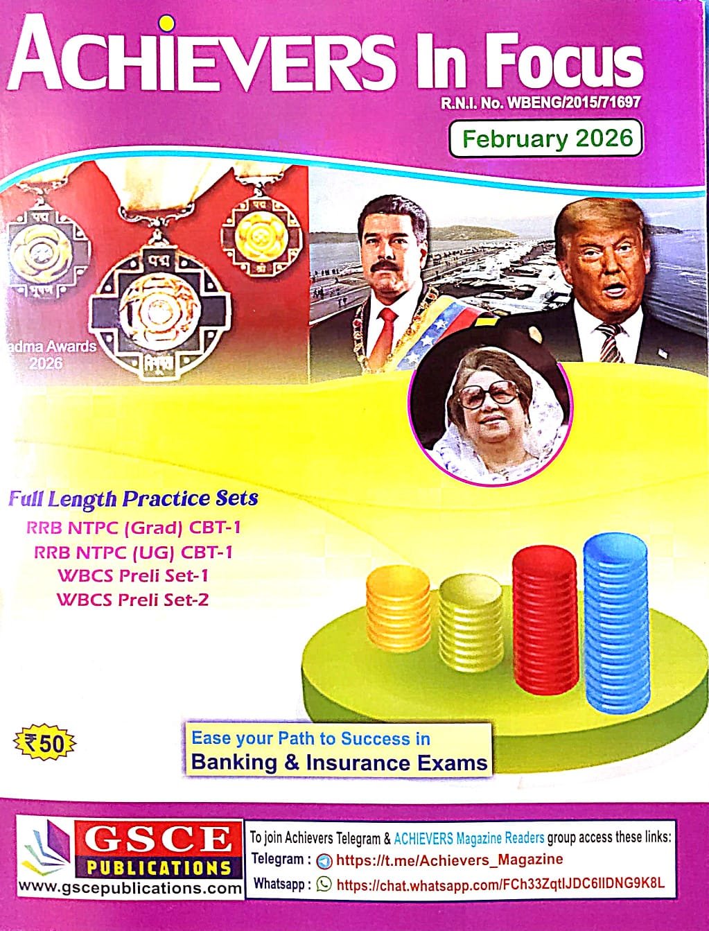 Achievers In Focus February’2026 Edition covers withΒ  full length practice sets of #RRB NTPC (Grad) CBT-1 # RRB NTPC (UG) CBT-1 # WBCS Preliminary Set 1 & 2